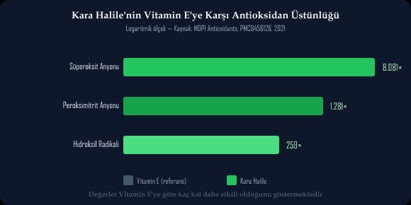 En çarpıcı bulgu ise antioksidan gücüne dair. Antioksidanlar, vücuttaki serbest radikalleri (hücrelere zarar veren, yaşlanmayı ve hastalıkları hızlandıran kararsız moleküller) etkisiz hale getiren koruyuculardır. 2021 yılında yapılan bir araştırma, kara halile'nin bu gücünü Vitamin E ile karşılaştırdı (2):