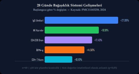 Katılımcıların genel bağışıklık fonksiyon puanları başlangıca göre %84,68 iyileşti (4).